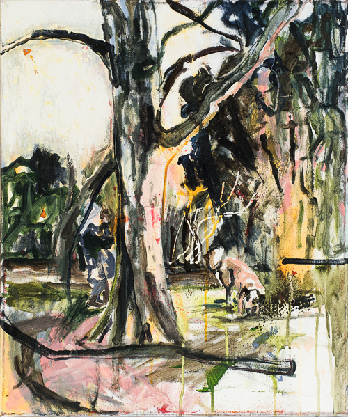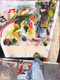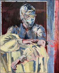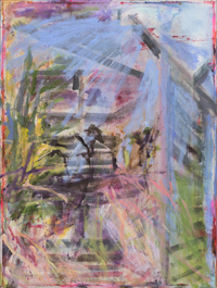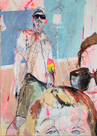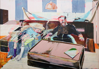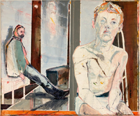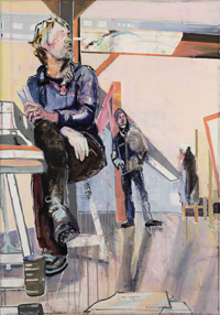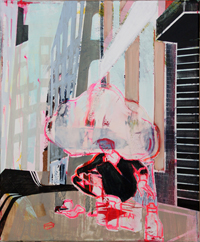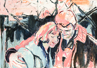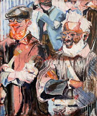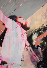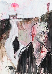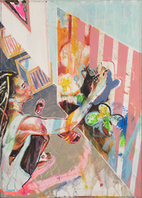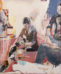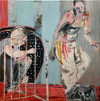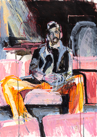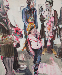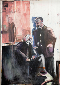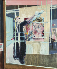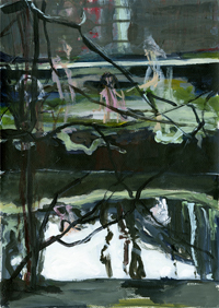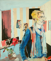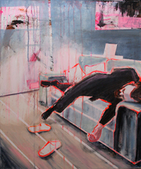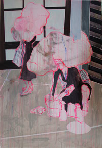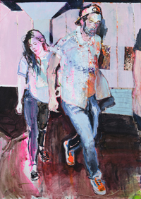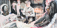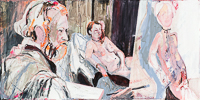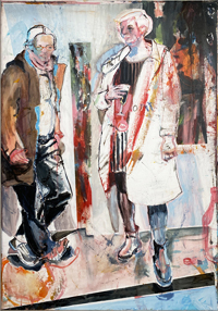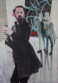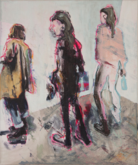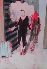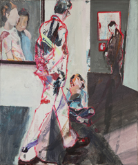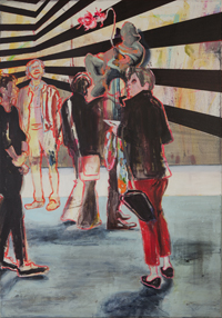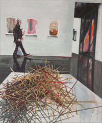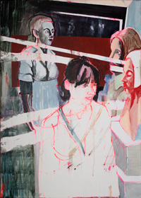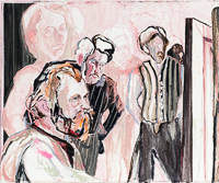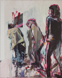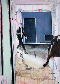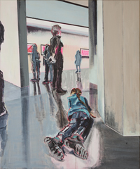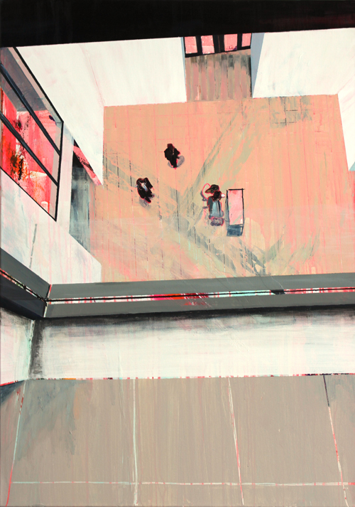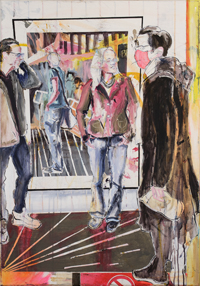 Gestisch gemalte Menschen wandeln in hermetisch wirkenden Räumen - in