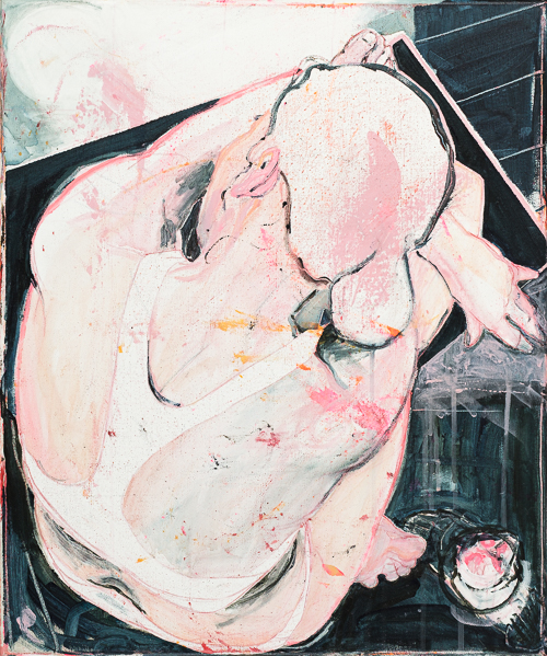Blick nach unten - Selbstporträt, Acryl und Polychromos auf Leinwand, 60 x 50 cm, 2025