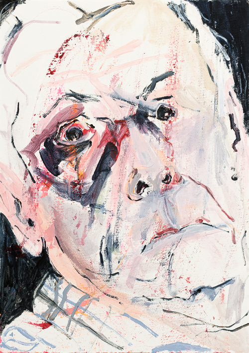 mit fast geschlossenen Augen, Acryl und Polychromos auf Papier, 48 x 34 cm, 2025
