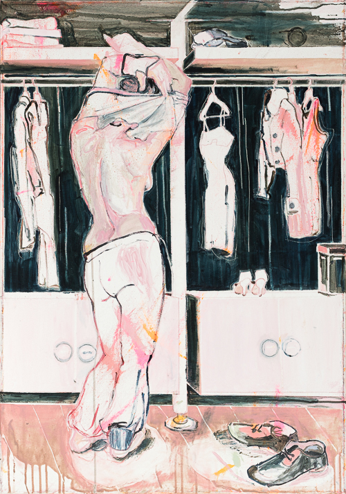 vorm Kleiderschrank, Acryl und Polychromos auf Leinwand, 100 x 70 cm, 2025